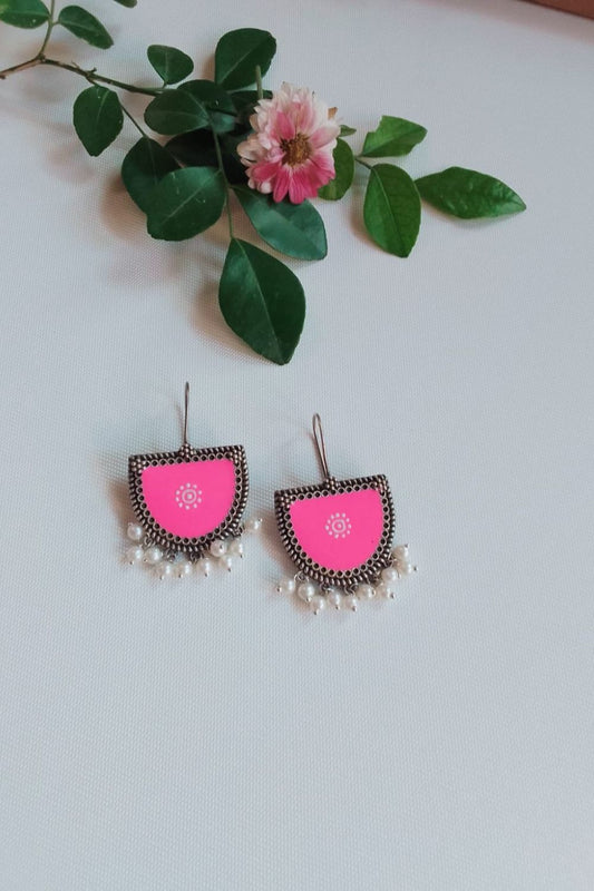 Aatmika (Pink & White) - Premium Quality Oxidised Danglers (Hand Painted)